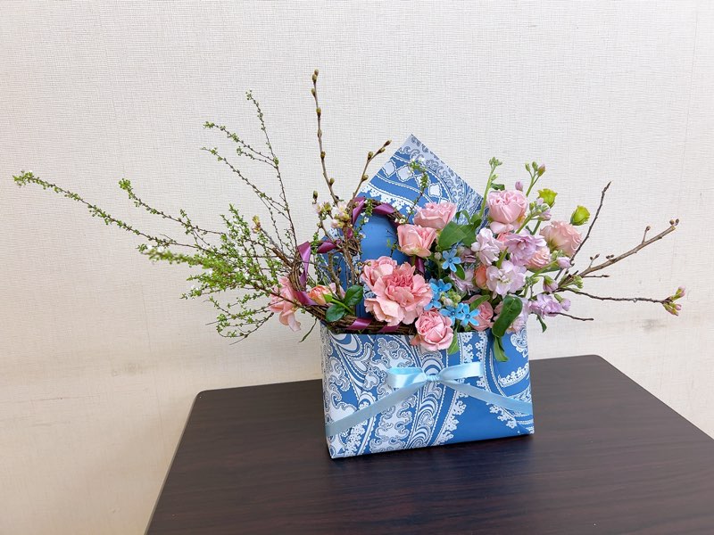 少し巻きが入ったようなスプレーバラがとてもかわいいですし、桜や雪柳も伸びやかな春を演出してくれます。