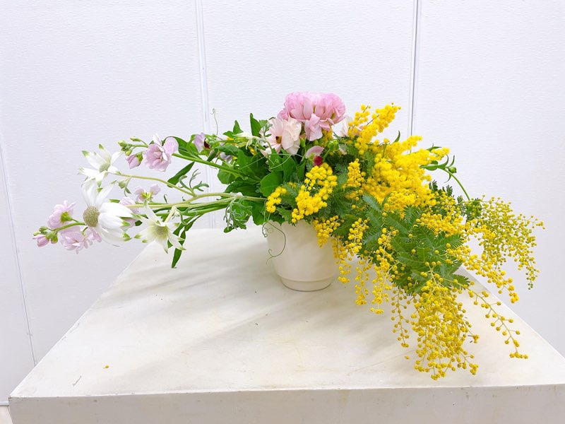 ミモザもそんな春の花の一つ。殺風景な冬の景色をパッと明るく変えてくれる春の花ですね。そんなミモザや、くるくるしたヒゲがとてもかわいいエンドウマメの花をふんだんに使ってのレッスンになります。
