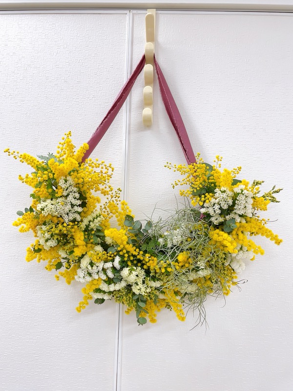 今回のテーマは「ミモザのドアスワッグorクレッセントリース」です。