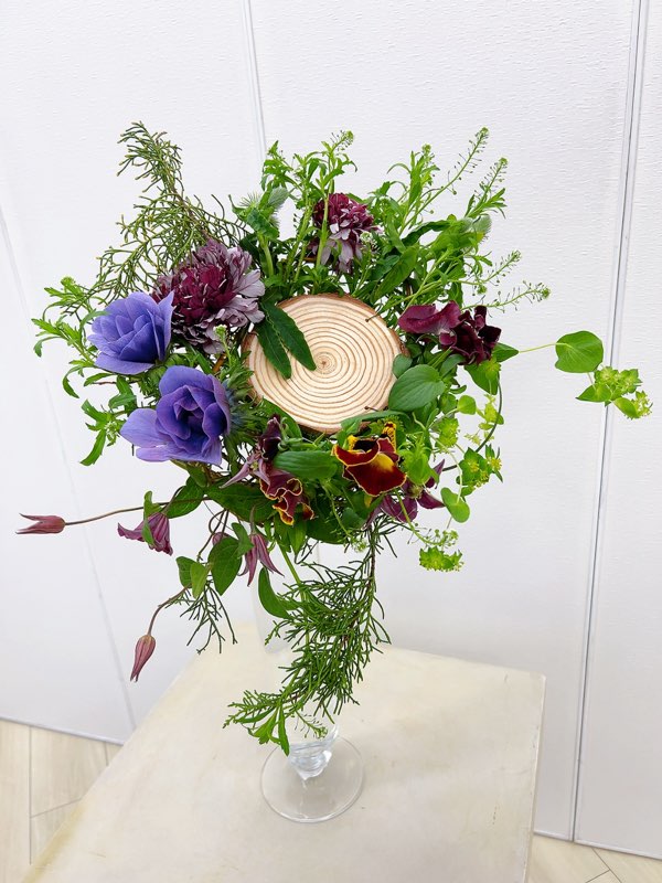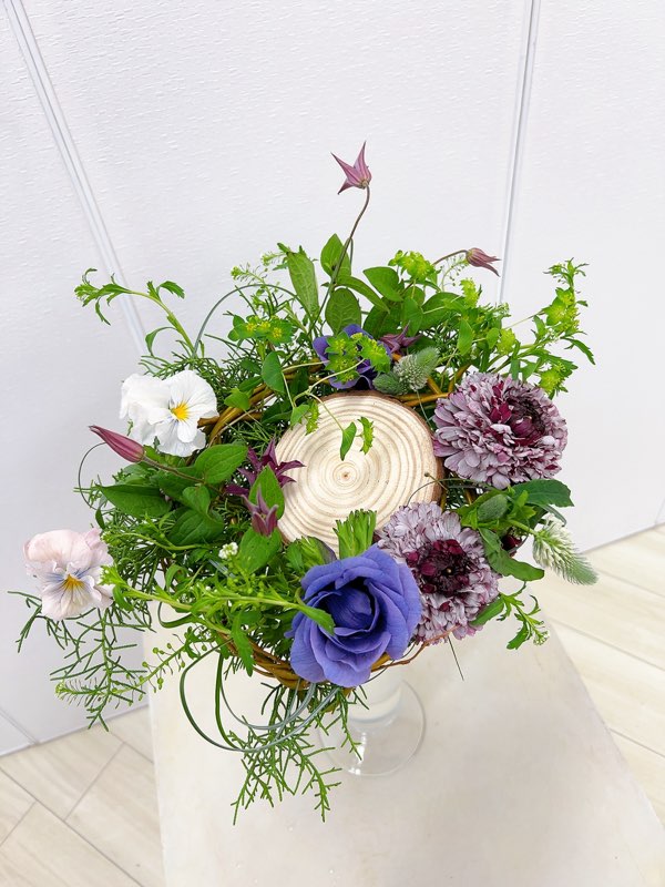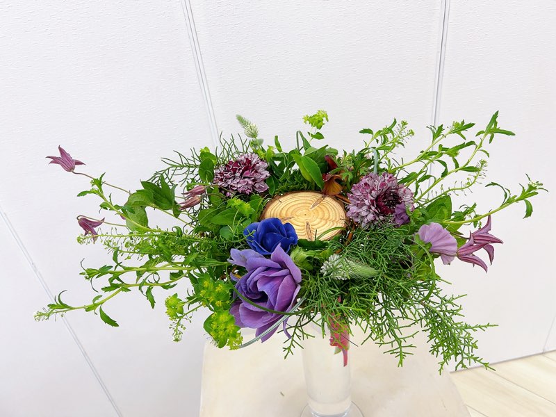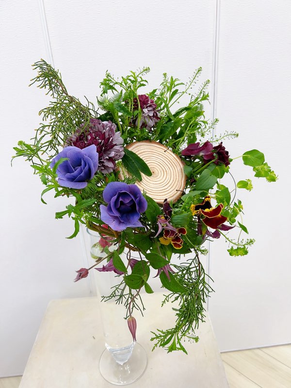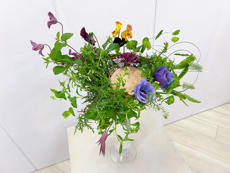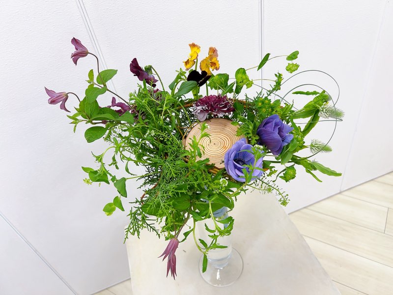 丸太スライス・ドラゴンウンリュウヤナギ・ナズナ・グリーンアイス・パンジー・ラナンキュラス・トリフォリウム・アネモネ・テッセン・ベアグラス