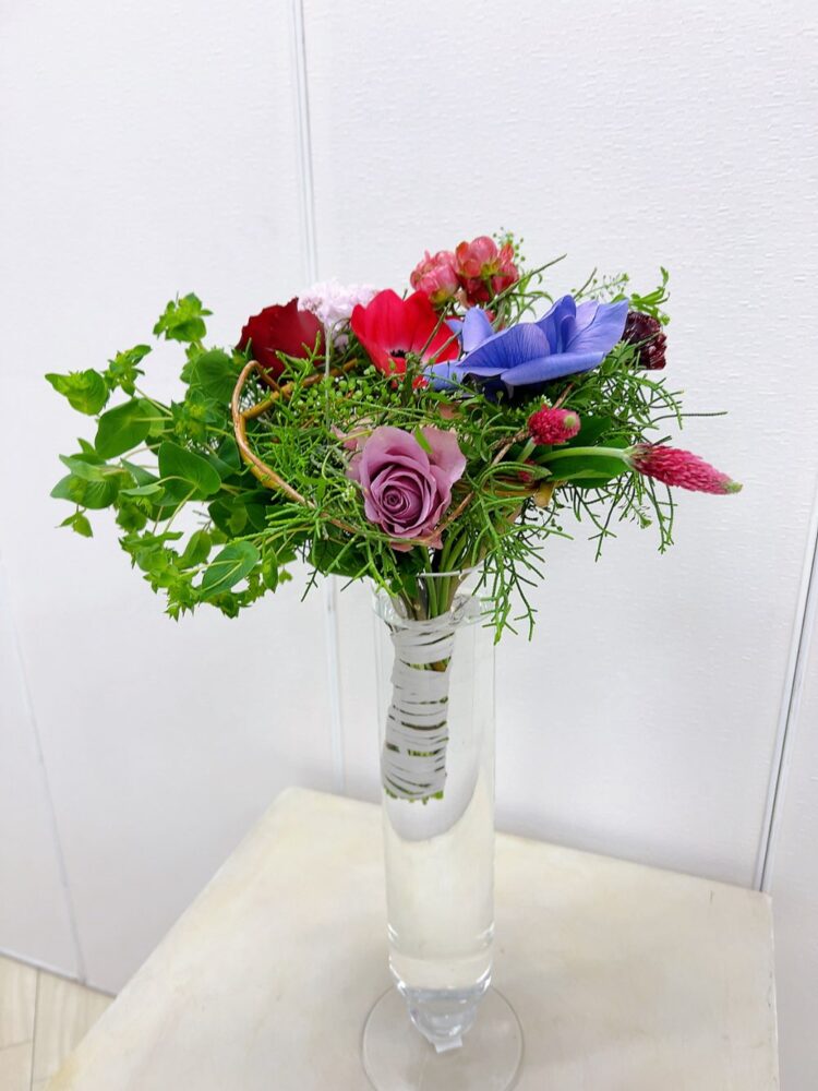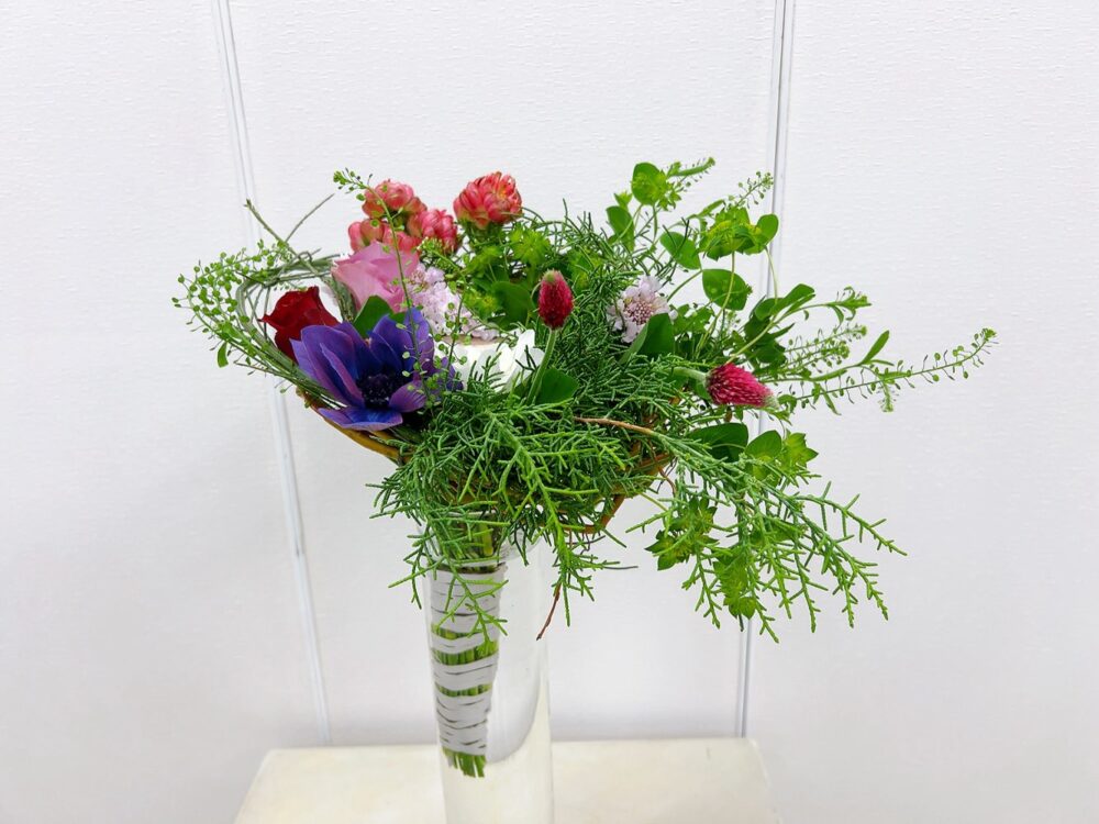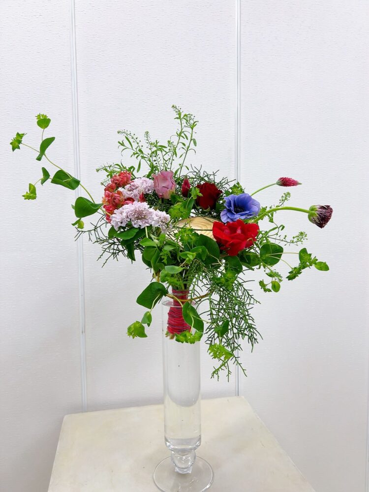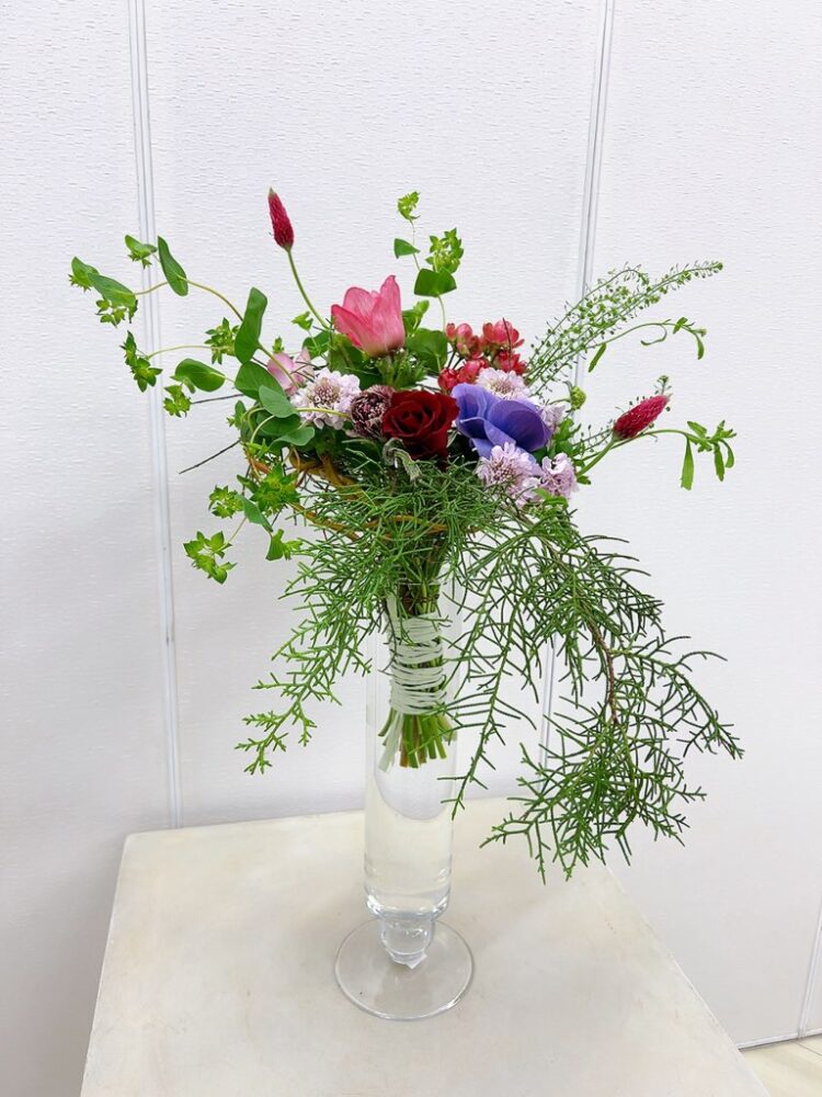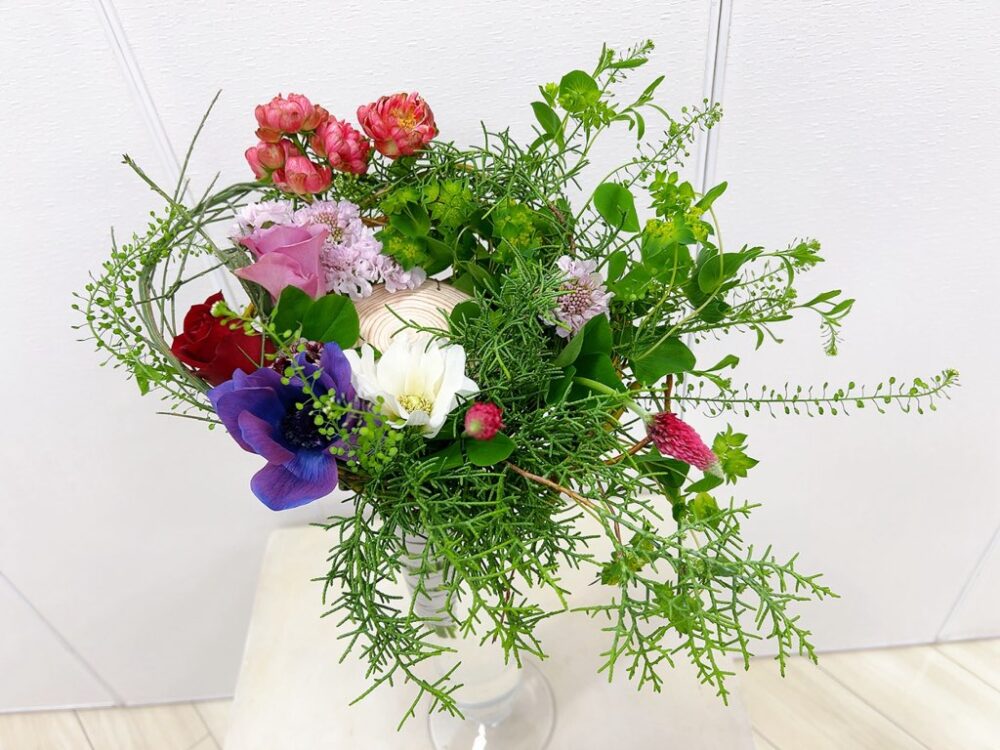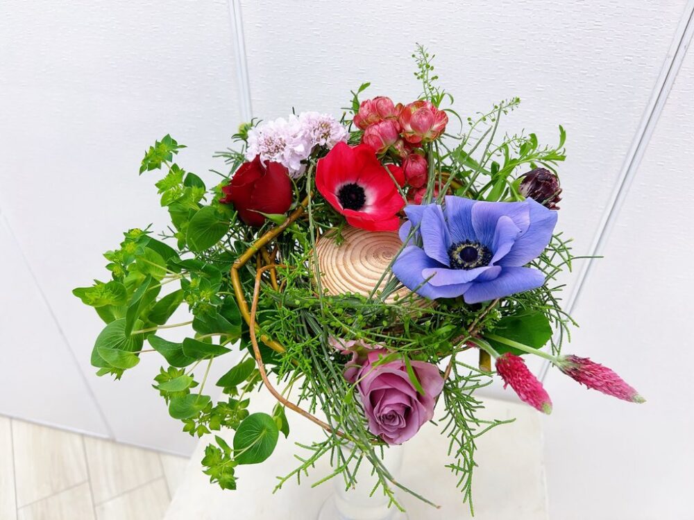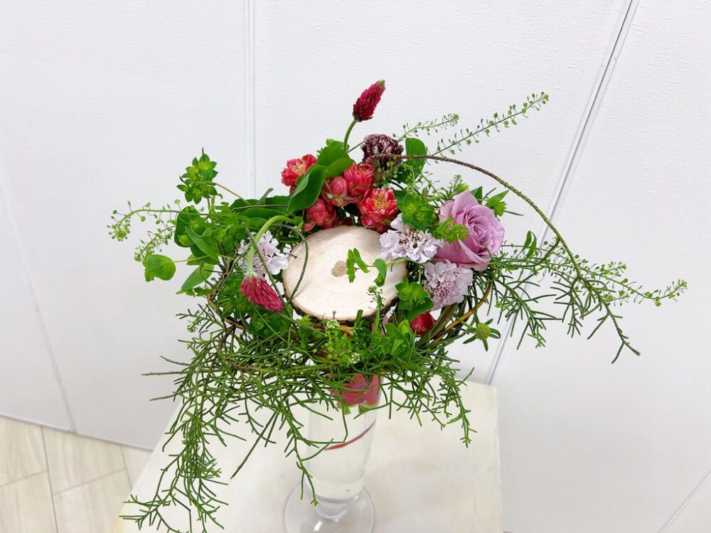コース案内 NEW 1月のブーケクラス マミフラワー講師資格取得コース UPDATE : 2026.01.29 <花材> 丸太スライス・ドラゴンウンリュウヤナギ・ナズナ・グリーンアイス・スプレーバラ・ブプレジューム・ラナンキュラス・ストロベリーキャンドル・バラ・スカビオサ・アネモネ