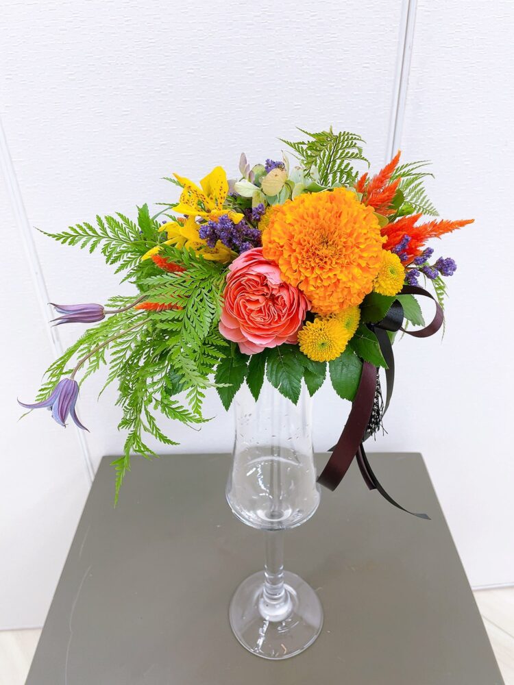コース案内 10月ブーケクラス<ハロウィンのホールディングボケー> マミフラワー講師資格取得コース UPDATE : 2023.11.20 <花材> マリーゴールド・ヤリケイトウ・ハイブリッドチース・モカラ・スプレーピンポンマム・秋アジサイ・タバリアファン・ホワイトスター・テッセン・バラ・木イチゴ紅葉・ドラセナ